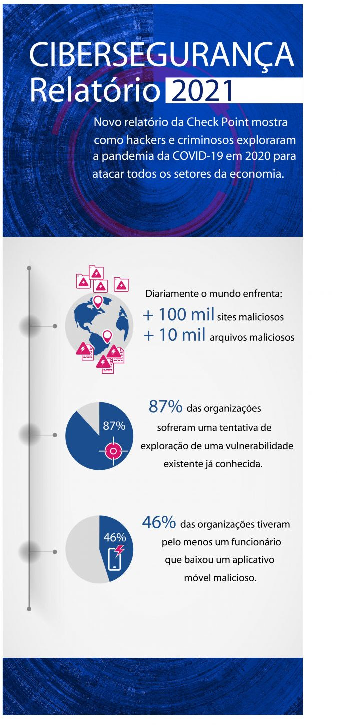 A Check Point Research (CPR), braço de Inteligência em Ameaças da Check Point® Software Technologies Ltd. (NASDAQ: CHKP), uma fornecedora líder de soluções de cibersegurança global, publica o seu Relatório de Cibersegurança 2021. Os pesquisadores da empresa revelam neste documento os principais vetores de ataque e as técnicas criminais, políticas e de ataques de estado-nação que afetaram e continuam impactando organizações de todos os setores da economia. Atualmente, o mundo se depara diariamente com mais de 100 mil sites maliciosos e mais de 10 mil arquivos maliciosos; e 87% das organizações sofreram uma tentativa de exploração de uma vulnerabilidade existente já conhecida.