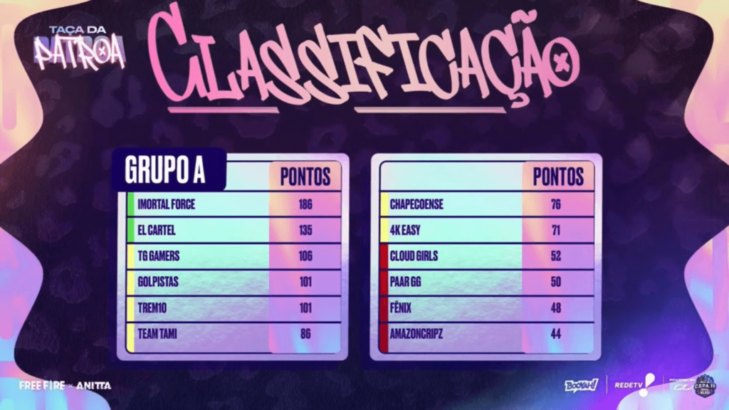 Na final, as equipes disputarão o título usando a personagem de Anitta, “A Patroa”, que chegará ao Free Fire em breve.