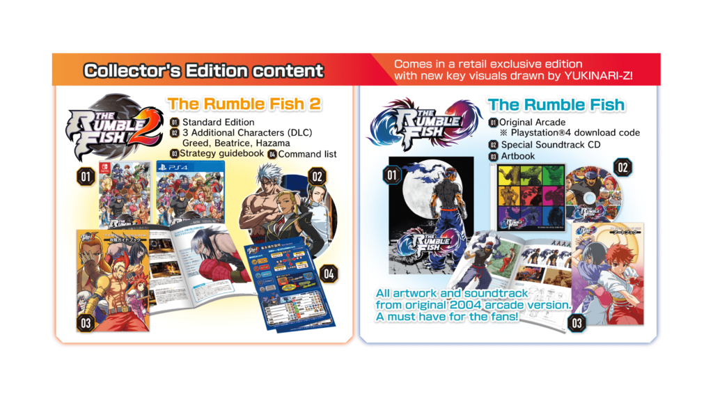 Ao lado do lançamento digital do jogo, os fãs do cult-classic poderão encomendar a edição física do Collector’s Edition do Rumble Fish 2, que incluirá a versão Rumble Fish Original Arcade do jogo. A versão Arcade Original Rumble Fish será um fiel porto da Versão Atomiswave e será exclusiva da versão física de varejo da Collector’s Edition. A Collector’s Edition estará disponível primeiro no Japão a partir de 8 de dezembro de 2022 e depois para o resto do mundo em uma data posterior.