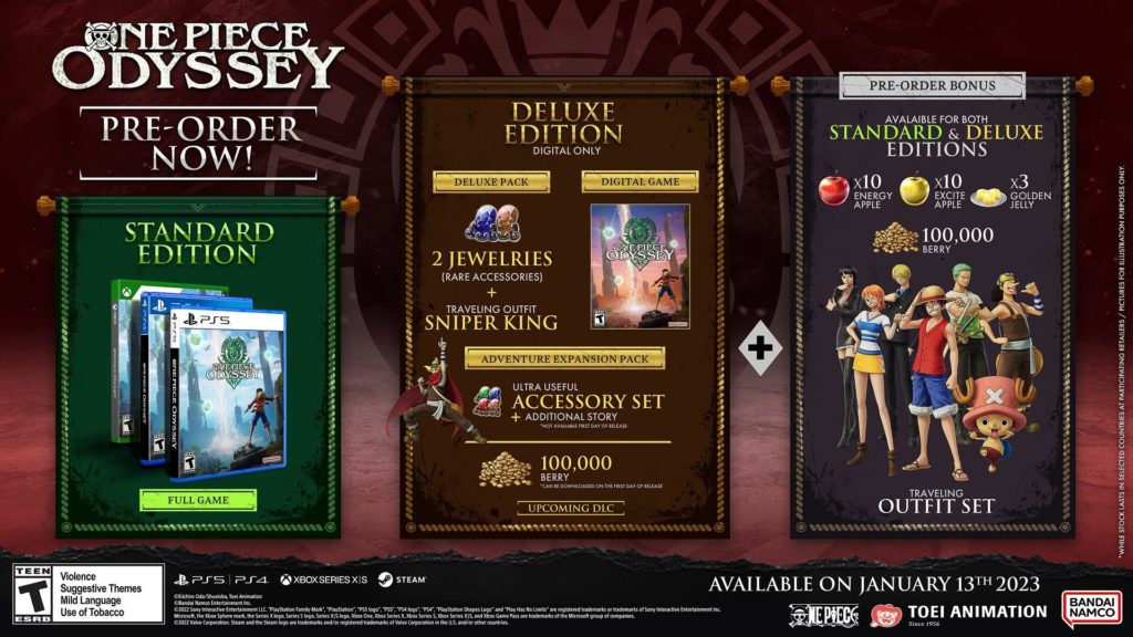 A publisher e desenvolvedora líder em videogames Bandai Namco Entertainment America Inc. anunciou hoje que ONE PIECE ODYSSEYo vindouro JRPG com história original canônica de ONE PIECE e jogabilidade que coloca jogadores no controle de seus personagens favoritos do Bando do Chapéu de Palha, será lançado mundialmente em 13 de Janeiro de 2023. O game ficará disponível para as plataformas PlayStation®4, PlayStation®5, Xbox Series X|S, e PC via STEAM®. Mais informações sobre o título estão disponíveis em sua página oficial.