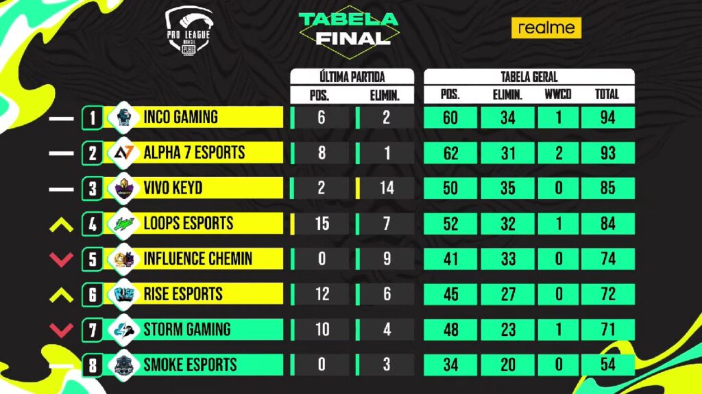 A iNCO Gaming é a grande campeã da PUBG MOBILE Pro League Brasil Fall 2022 (PMPL Brasil), com 94 pontos e uma vitória. A Alpha7 e a Vivo Keyd garantiram as duas vagas diretas para a PUBG MOBILE Global Championship 2022, pelos PMGC Points, durante a fase regular do campeonato.