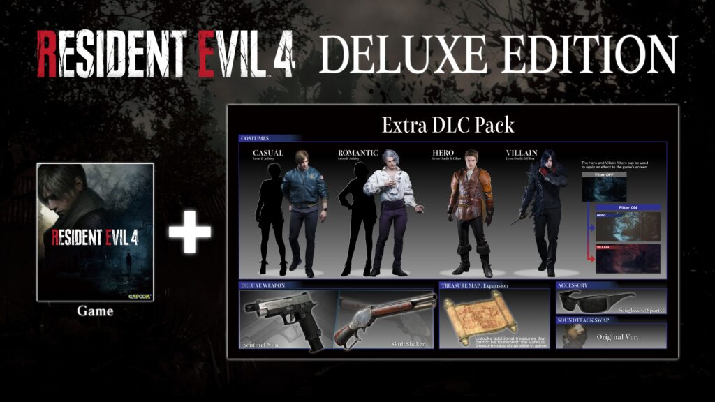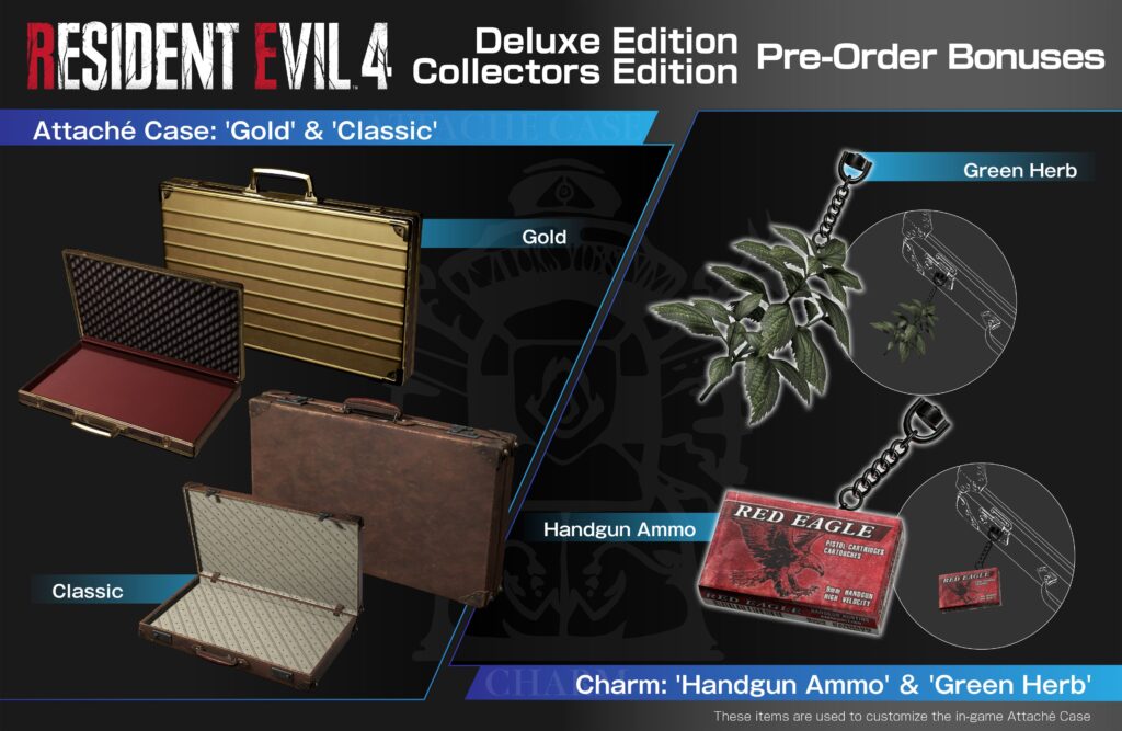 Além do anúncio do início da pré-venda de Resident Evil 4, que começa hoje, o Resident Evil Showcase também revelou que a versão Edição Deluxe digital estará disponível quando o jogo for lançado para PlayStation®5, PlayStation®4, Xbox Series X|S, e PC via Steam em 24 de março de 2023. A Edição Deluxe inclui conteúdos adicionais dentro do jogo, incluindo trajes, armas, um mapa do tesouro e mais. Consumidores que reservarem a Edição Standard receberão recompensas dentro do jogo, incluindo os itens “Maleta: Ouro” e o “Amuleto Especial: Munição para Pistola”, enquanto as reservas da Edição Deluxe também contarão com os itens “Maleta: Clássica” e “Amuleto Especial: Erva Verde”. Esses itens de personalização oferecem habilidades específicas no jogo quando equipados. Ambas as edições do jogo incluirão dublagem em português brasileiro.