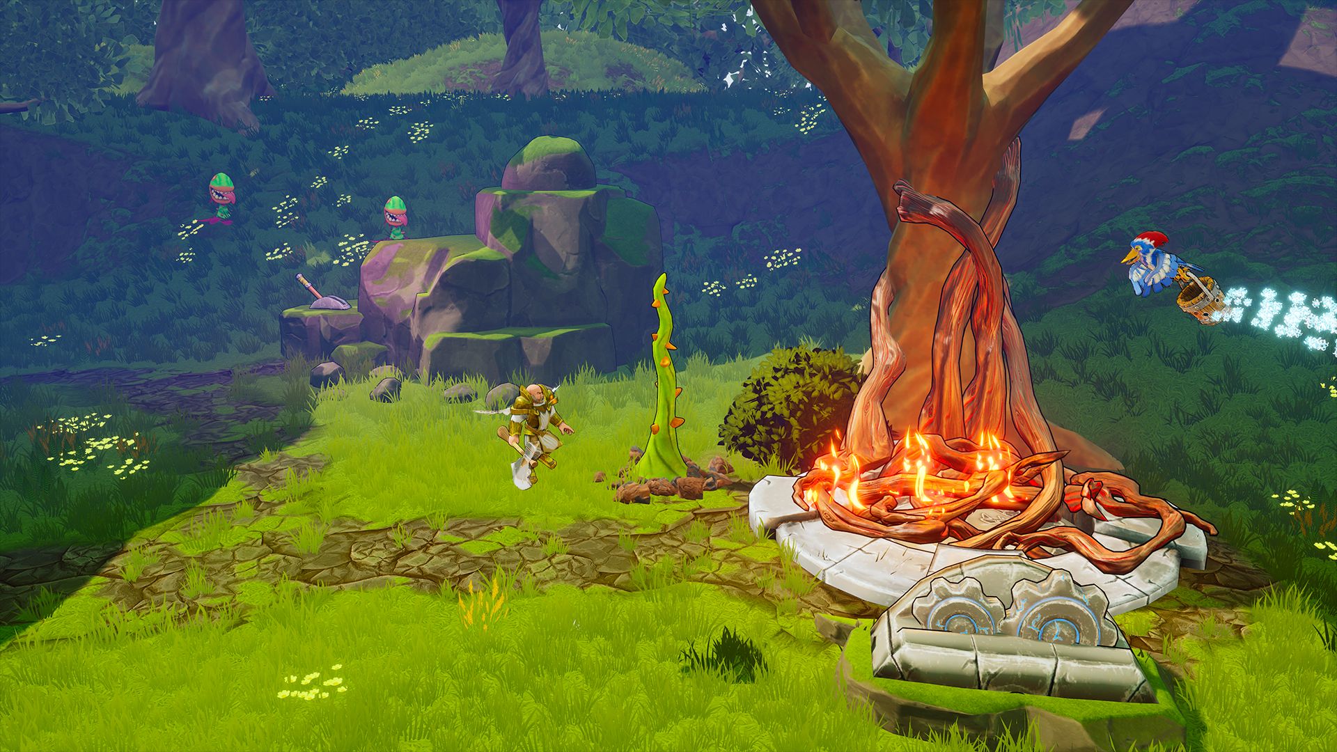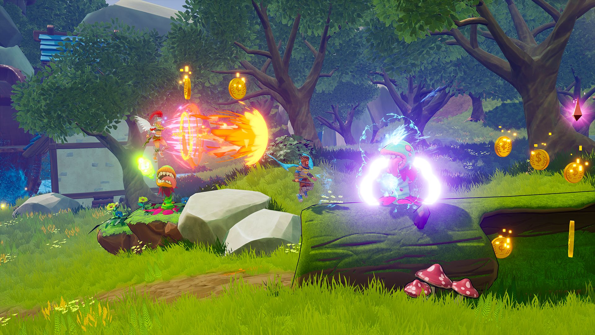 Jogue sozinho ou com até dois amigos na mesma tela e explore 7 regiões através de 35 cenários feitos a mão, cada um com sua própria configuração, desafios, recompensas especiais e itens únicos.