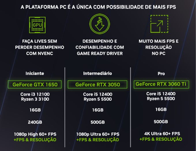 De acordo com gerente de Marketing técnico da NVIDIA, Alexandre Ziebert, abaixo estão três diferentes padrões de hardware sugeridos para aproveitar o jogo. Veja qual mais se adapta ao seu perfil e se prepare para entrar em campo!