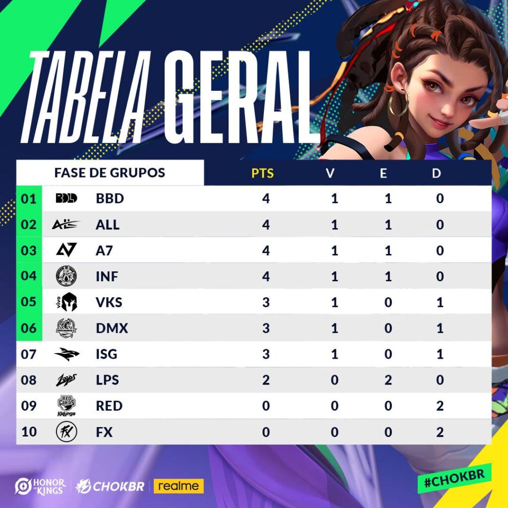 Nenhuma equipe garantiu a vitória em suas duas séries no primeiro final de semana do CHOKBRAll Gaming ClubBeBold e Influence Rage seguem liderando a tabela com 1 vitória e 1 empate cada, enquanto três equipes – LoopsRED Canids e Fluxo – ainda não garantiram o 2×0 em nenhuma série. Apenas a RED Canids e o Fluxo perderam ambas as séries disputadas até agora.
