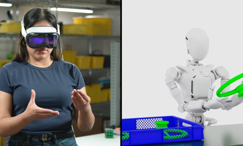 Começando com o fluxo de trabalho GR00T-Teleop, os usuários podem aproveitar o Apple Vision Pro para capturarem ações humanas em um gêmeo digital. Essas ações humanas são imitadas por um robô na simulação e gravadas para uso como dados reais.