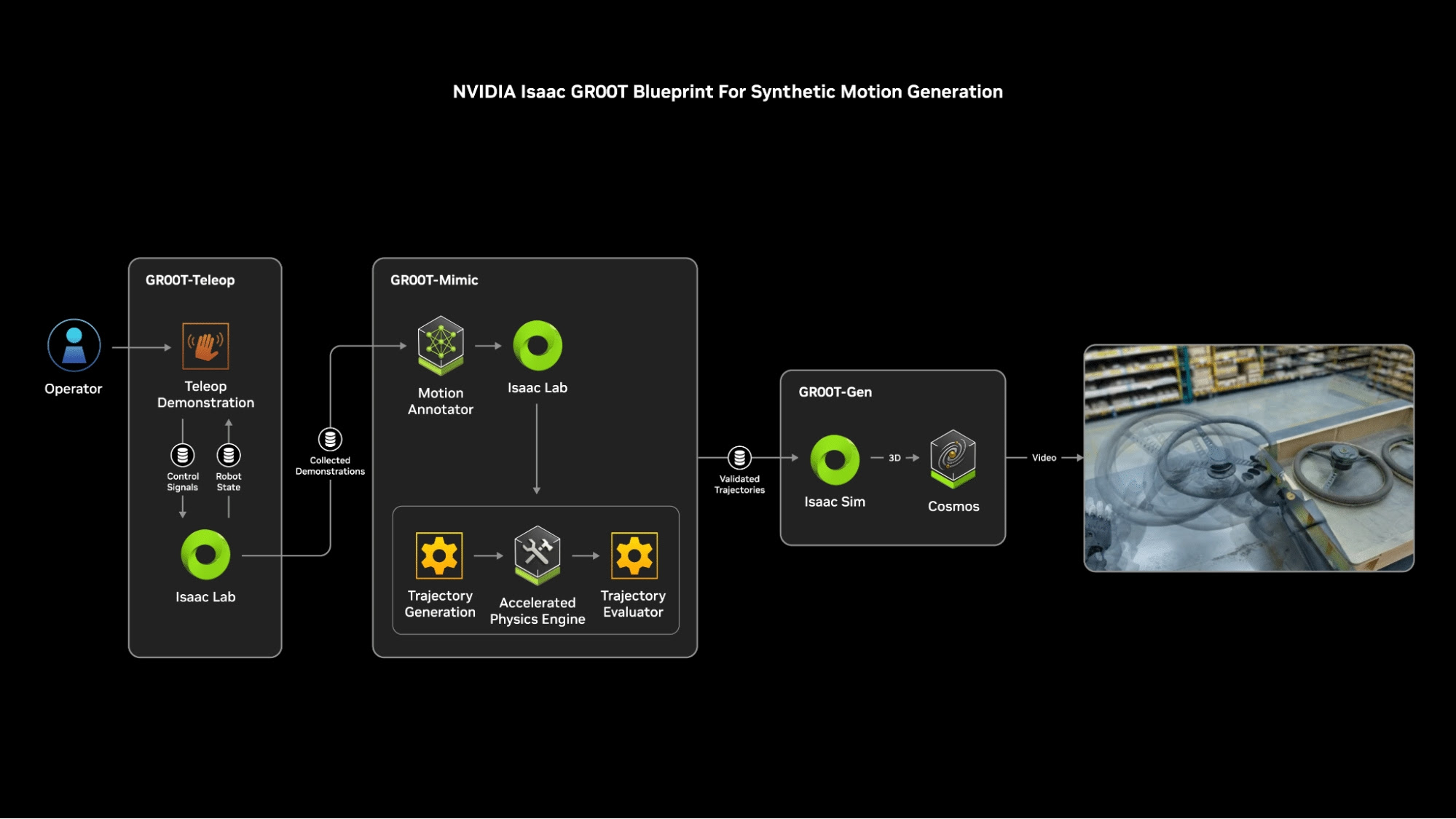 O fluxo de trabalho GR00T-Mimic então multiplica a demonstração humana capturada em um conjunto maior de dados de movimentos sintéticos. Para terminar, o fluxo de trabalho GR00T-Gen, baseado nas plataformas NVIDIA Omniverse e NVIDIA Cosmos, expande exponencialmente esse conjunto de dados por meio da aleatorização e do upscaling 3D.