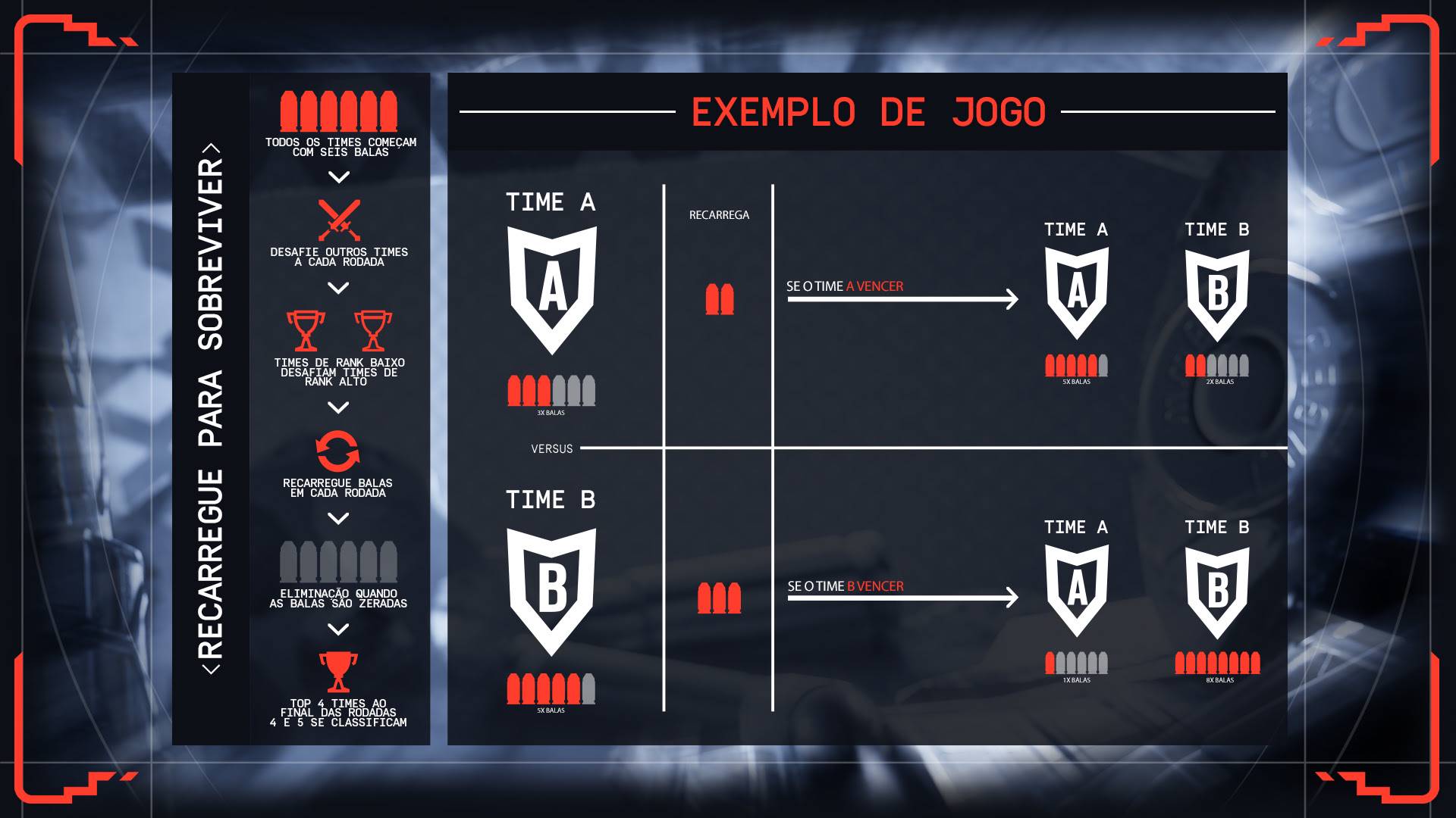 Na primeira fase da competição, haverá cinco rodadas de disputa, nas quais as equipes poderão “recarregar” (reload, em inglês) um número determinado de balas ao enfrentar um adversário.