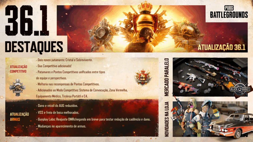 A KRAFTON, Inc. lançou a Atualização 36.1 para PUBG: BATTLEGROUNDS no PC, com a versão de consoles programada para chegar em 19 de junho. Entre as novidades estão uma reformulação abrangente do Sistema Competitivo e o lançamento antecipado do Mercado Paralelo de 2025.