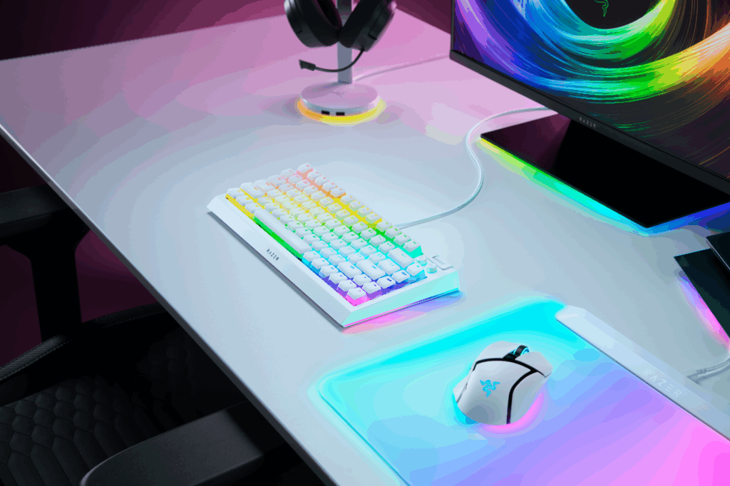 Para completar a montagem personalizada, os usuários podem escolher entre os modelos de switches Mecânicos da Razer de 3ª Geração, que são vendidos separadamente em pacotes de 36 unidades. As opções incluem os icônicos switches verdes, com clique tátil, os amarelos, para digitação suave e linear, e os laranjas, ideais para quem prefere feedback tátil e sem o clique audível. O kit de keycaps Razer Phantom para upgrade, disponível em preto e branco, complementa as possibilidades de personalização do visual e potencializa os efeitos de iluminação RGB do teclado.
