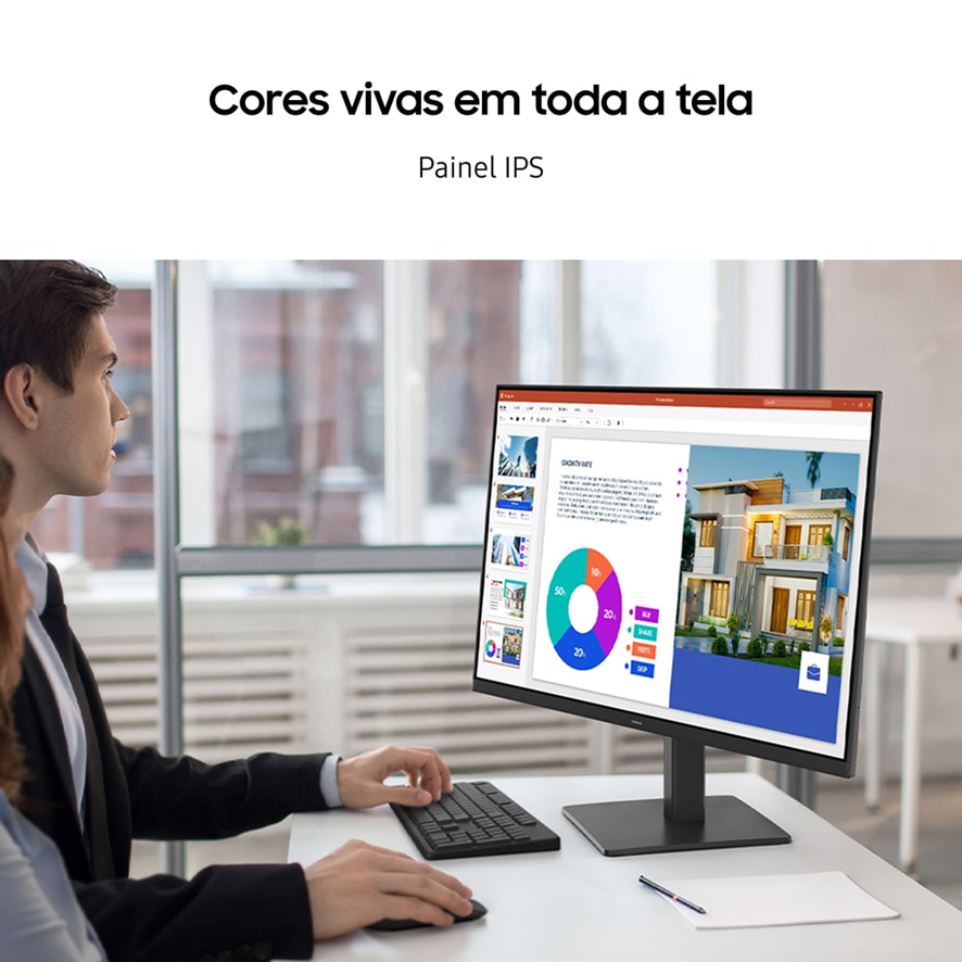 O modelo ainda traz conectividade múltipla e estética moderna, para se adequar a diversos tipos de tarefas e ambientes. Com ele, é possível conectar dispositivos diretamente ao monitor para obter mais flexibilidade, tornando o ambiente de trabalho mais conveniente. Além disso, seu design sofisticado, com bordas ultrafinas, faz com que o monitor se encaixe em diversas configurações, independente do ambiente.