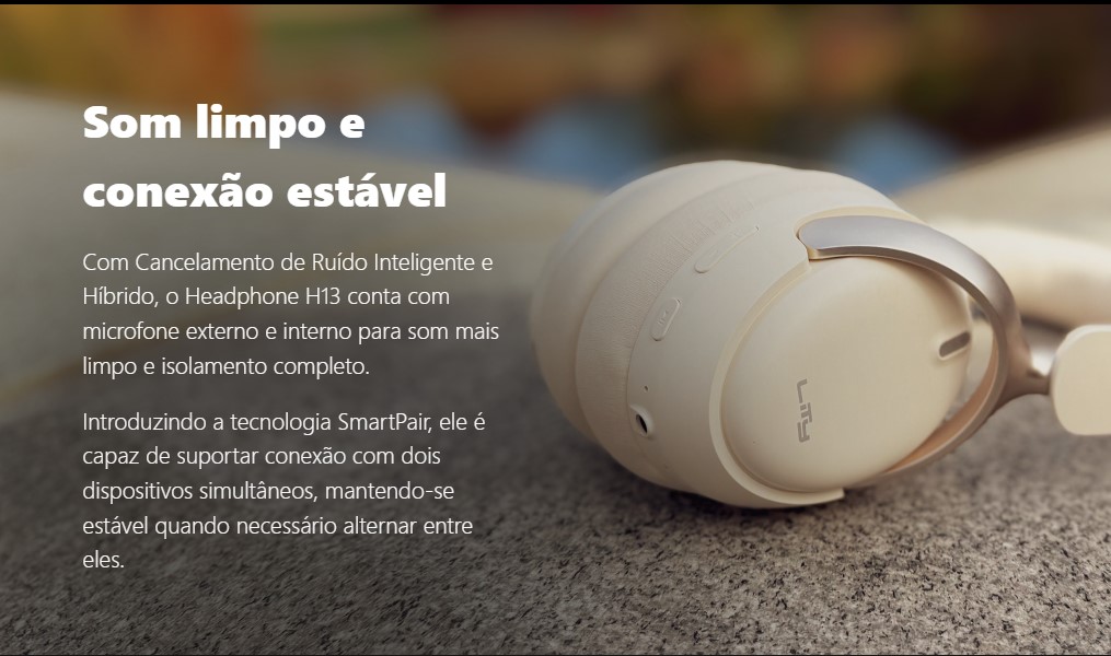 As conchas são grandes e macias, cobrindo toda a orelha. Elas também são revestidas com VelvedPad, proporcionando um isolamento passivo excelente. O H13 pode ser encontrado nas cores preto ou branco. Nas conchas, você encontra o logo da Lity e pequenos microfones externos, essenciais para os modos de Cancelamento de Ruído Ativo (ANC) e Transference (som ambiente), além de ajudarem na qualidade das chamadas.