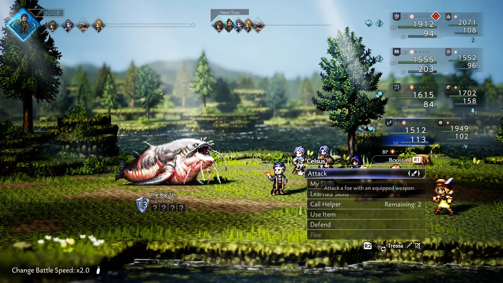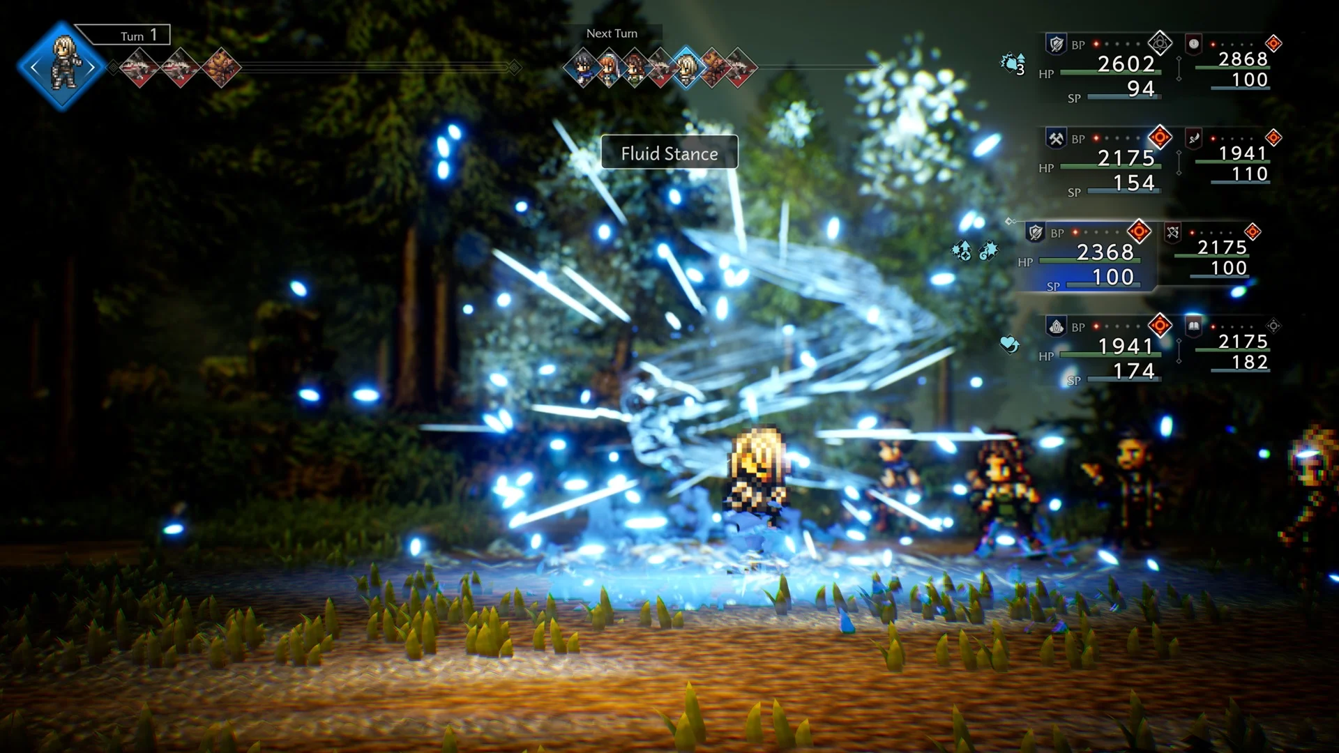 O combate de Octopath Traveler 0 é, sem dúvida, o ponto alto da experiência. Ele pega o sistema tradicional por turnos da franquia e o expande de maneira magistral. A grande novidade é a capacidade de usar oito personagens em combate, divididos entre linhas de frente e retaguarda. Essa mecânica de troca tática é vital, permitindo que você aproveite buffs passivos e habilidades específicas, transformando cada turno em um xadrez estratégico.O sistema de “Break” (quebra de defesa ao explorar fraquezas) e o uso de Battle Points (para potencializar ataques) retornam e estão mais afiados do que nunca. Chefes avançados exigem um domínio completo dessas mecânicas, punindo a repetição e forçando o jogador a improvisar e a fazer substituições táticas constantes.