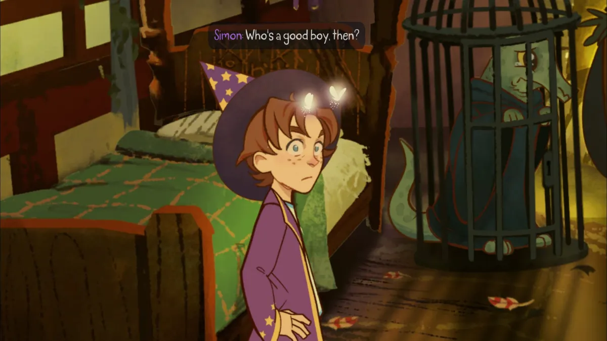 A história de Origins nos apresenta a um Simon ainda adolescente, preguiçoso, mal-humorado e recém-chegado a uma nova casa. A vida mundana do garoto é interrompida quando um portal mágico se abre, sugando-o para um mundo de fantasia. A premissa é clássica, mas o tratamento é moderno: o jogo é uma história de origem que se diverte com o fato de ser uma. Simon é rapidamente envolvido em uma profecia que o coloca na missão de encontrar os tomos do Primeiro Mago, um artefato cobiçado pelo vilão Sordid, que aqui aparece em uma versão menos ameaçadora, mas igualmente maligna. Ao longo da jornada, Simon encontra aliados carismáticos, como o excêntrico mago Calypso e o adorável cão Chippy. O grande trunfo da história é o humor. O jogo está repleto de referências à cultura pop (de Game of Thrones a Rickroll) e de quebras da quarta parede, onde Simon olha diretamente para o jogador, reclamando de ter que andar ou de nossas tentativas frustradas de resolver um puzzle. É um texto afiado e fiel ao espírito original, que conta até com o retorno do dublador clássico, Chris Barrie, garantindo a autenticidade do tom.