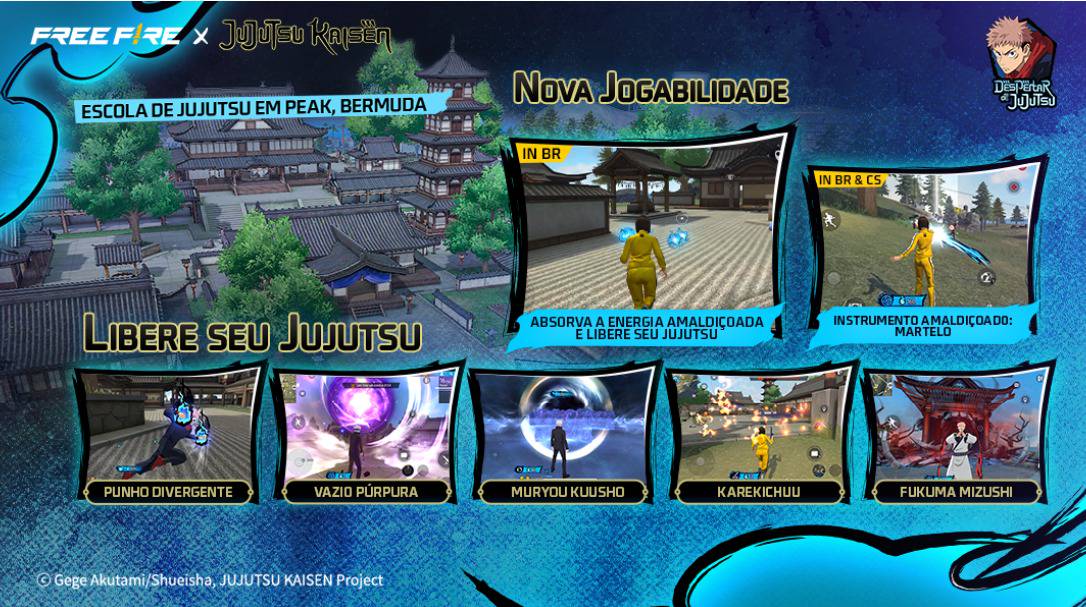 Popular entre os fãs, a colaboração será lançada com a mais ambiciosa reformulação da Peak até agora, transformando a área mais popular de Bermuda numa Escola de Jujutsu ao melhor estilo Free Fire. Projetada com detalhes meticulosos e uma atmosfera inconfundível do anime, a nova área mergulha totalmente os jogadores no mundo de Jujutsu Kaisen.