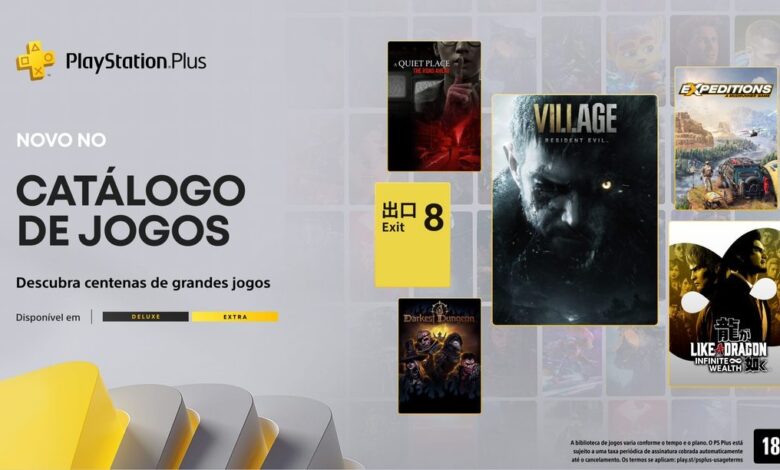 No Game Catalog, os destaques incluem Resident Evil Village e Like a Dragon Infinite Wealth, acompanhados por uma seleção variada de gêneros. A lista completa inclui: