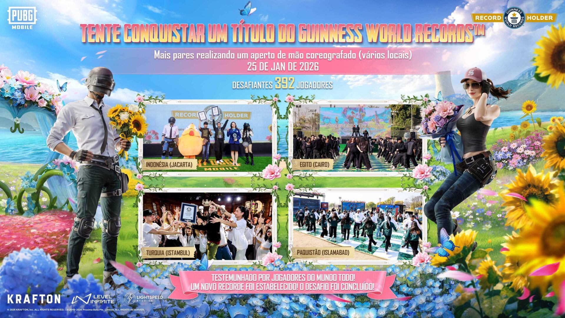 Inspirado nos laços criados em PUBG MOBILE, a tentativa de quebrar o recorde do Guinness World Record™ aconteceu no dia 25 de janeiro, mostrando como jogadores de diferentes culturas, regiões e comunidades estão unidos e reforçando a força da base de jogadores global. Um total de 392 participantes se juntaram em quatro locais públicos icônicos: Lapangan Banteng Park em Jakarta, Indonésia; Fişekhane em Istambul, Turquia; Guzeria Youth Center em Cairo, Egito e Fatima Jinnah Park (F-9 Park) em Islamabade, Paquistão. Cada localização representa um ponto cívico e cultural na sua cidade, destacando a conexão de PUBG MOBILE com a vida da comunidade.
