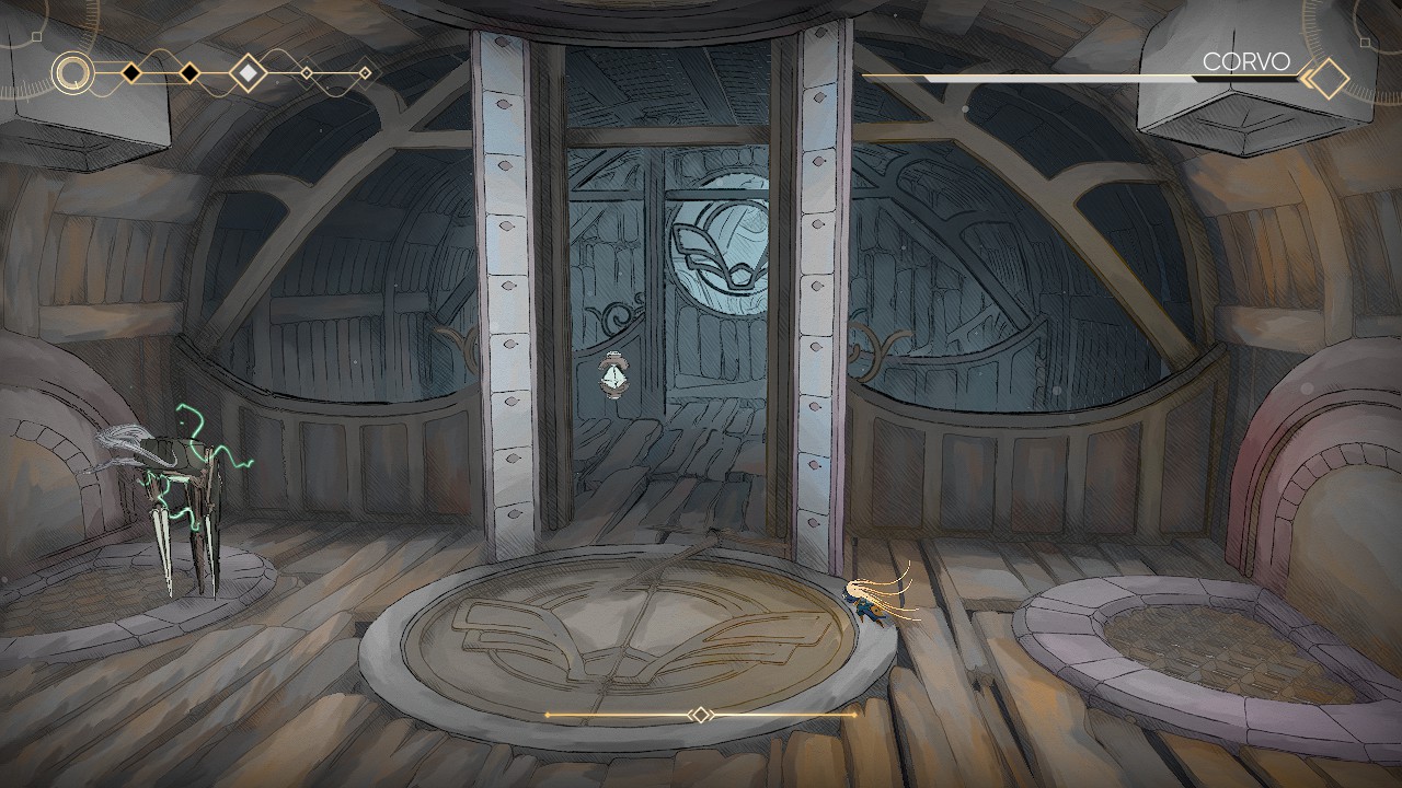 A narrativa é contada de forma não-linear e bastante interpretativa, o que faz você vasculhar cada canto da Nau em busca de arquivos e documentos que revelam pedaços da história. É um estilo que lembra bastante Hollow Knight, onde a lore é mais sugerida do que explicitada. E, no meio de tanta desolação, encontro com NPCs carismáticos, como a MEL, que ajudam a entender um pouco mais desse universo.