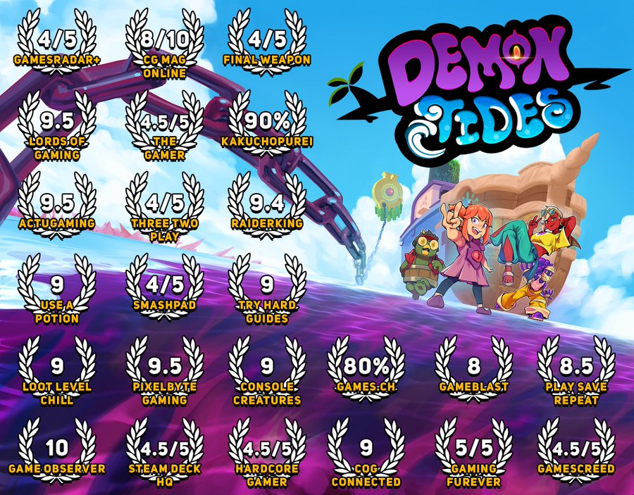Há oceanos para explorar e movimentos para dominar em Demon Tides , o novo e expressivo jogo de plataforma 3D da Fabraz, o estúdio independente por trás dos futuros Bubsy 4D e Demon Turf. Descrito pela GamesRadar como uma mistura de Super Mario Odyssey com Wind Waker, Demon Tides ostenta uma nota de 84 no Metacritic e 96% nas avaliações do Steam, então não perca! Atravesse oceanos em alta velocidade e desvende os segredos sombrios do reino no jogo de plataforma 3D Demon Tides!