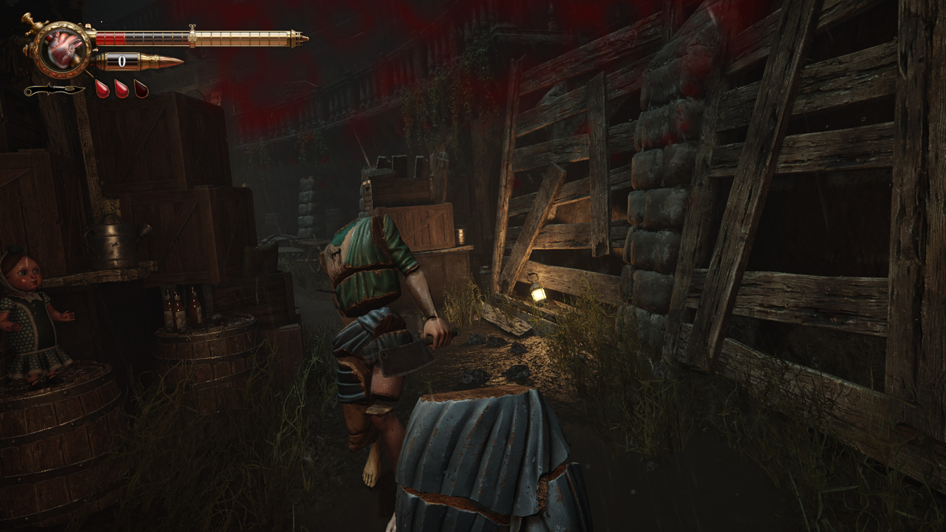 O coração do gameplay de Crisol: Theater of Idols reside em sua mecânica mais distintiva: o uso do próprio sangue de Gabriel como munição para suas armas. Cada tiro disparado consome uma porção da barra de vida do protagonista, forçando o jogador a uma gestão constante e estratégica entre sua saúde e seu poder de fogo. Para reabastecer o sangue, Gabriel pode utilizar seringas de Plasmarina ou absorver o líquido vital de animais e cadáveres espalhados pelo cenário. Essa mecânica, embora inovadora, pode gerar opiniões divididas, eu falo isso porque, apesar deser uma mecânica bem legal e ter uma profundidade tática, o game lhe consede muitos recursos de cura pode diluir a sensação de escassez e o impacto da decisão, especialmente em dificuldades mais baixas.