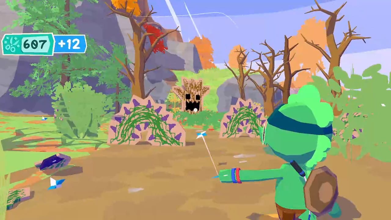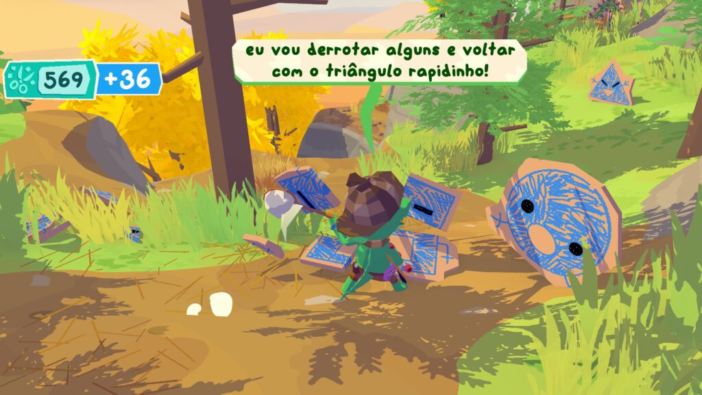 Esqueça combates complexos e barras de vida. Em Lil Gator Game, o sistema de combate é uma extensão da brincadeira de faz de conta. Os “inimigos” são criaturas de papelão, como slimes, esqueletos e morcegos, que não oferecem perigo real. Ao “derrotá-los” (quebrando-os), você coleta confetes e pedaços de papel, a “moeda” do jogo. Essas batalhas são simples e servem para coletar recursos e reforçar a atmosfera lúdica do game. As “armas” são objetos do cotidiano transformados pela imaginação, como gravetos, arminhas de água,  espadas de madeira e até sabres de luz de brinquedo, cada um com sua própria animação divertida.