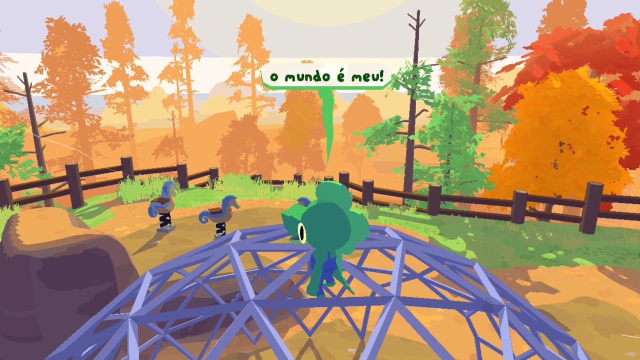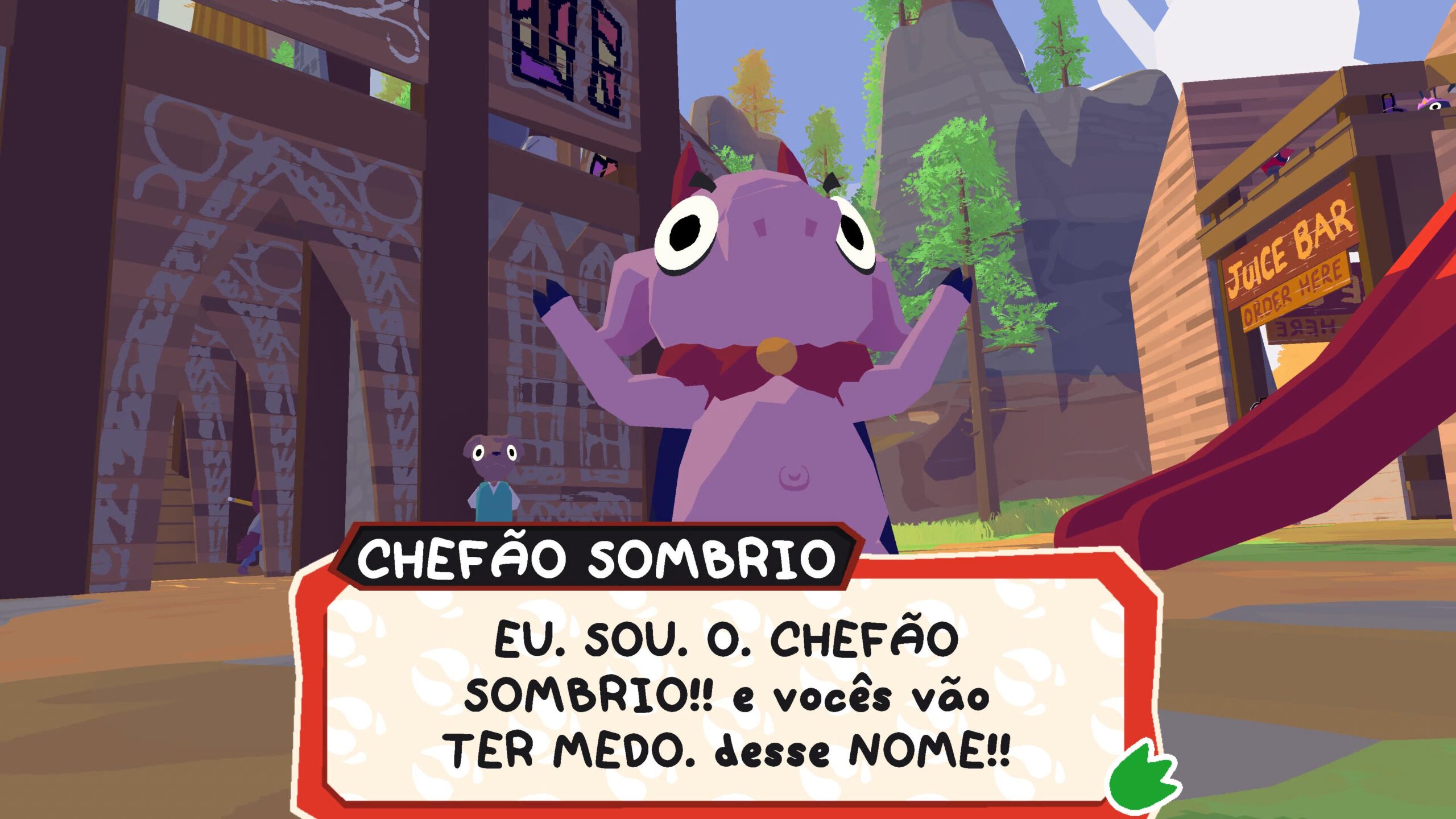 Os gráficos de Lil Gator Game são simples, mas cheios de personalidade. O estilo visual cartunesco e colorido é encantador e se encaixa perfeitamente na proposta do jogo, remetendo à estética de desenhos animados infantis. A direção de arte é charmosa e eficaz. A trilha sonora é um show à parte, com músicas que capturam a essância da brincadeira e da infância, criando uma atmosfera acolhedora e nostálgica. Os efeitos sonoros, como o barulho de quebrar os inimigos de papelão, são satisfatórios e contribuem para a imersão. A ausência de dublagem não é um problema, pois a expressividade dos personagens e a qualidade da trilha sonora compensam. Além disso, o jogo conta com uma excelente localização para o português do Brasil, com piadas e trocadilhos que enriquecem ainda mais a experiência.