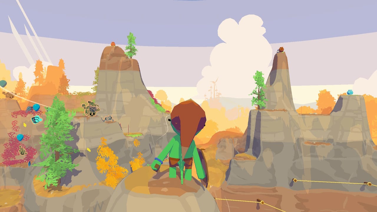 A ilha principal de Lil Gator Game é um mundo aberto pequeno, mas densamente povoado e cheio de personalidade. Cada canto é um convite à exploração, com montanhas para escalar, rios para nadar e florestas para desbravar. A ambientação é colorida e charmosa, com um estilo visual que remete a desenhos animados. A DLC In the Dark introduz um novo mapa subterrâneo, um vasto sistema de cavernas que, apesar de ser “no escuro”, é vibrante e iluminado, com túneis aconchegantes e segredos cintilantes. Essa expansão dobra o tamanho do mundo jogável e oferece uma geografia mais vertical, com “salões” bem definidos, proporcionando uma experiência de exploração renovada. A falta de um mapa no jogo base pode ser um ponto de atenção, mas o design inteligente dos cenários minimiza a frustração, incentivando a descoberta orgânica.