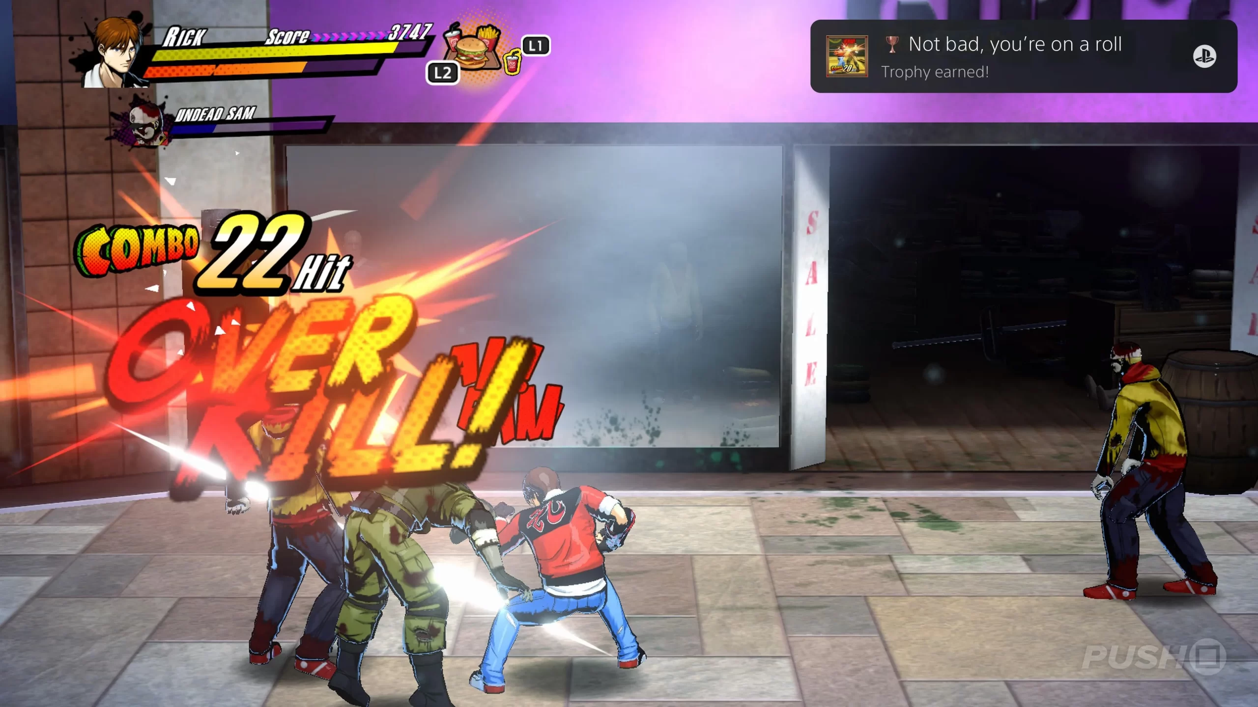 •Gestão de Itens: É possível carregar armas e alimentos para uso posterior. No furgão (área de repouso entre fases), o jogador pode combinar alimentos para criar “comidas combo” com bônus estratégicos.