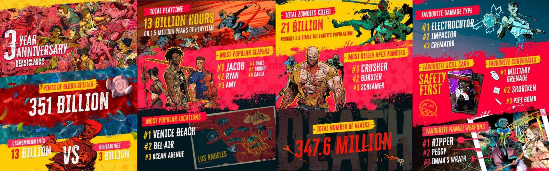 Pelas ruas encharcadas de sangue de HELL-A, Dead Island 2 ofereceu caos destruidor de zumbis tátil e estilhaçante para fãs ao redor do mundo. As celebrações do aniversário são um agradecimento à comunidade apaixonada por manter a ilha viva desde o lançamento e um lembrete de que o Zompocalipse está longe de acabar, com muita vida ainda nos mortos-vivos.
